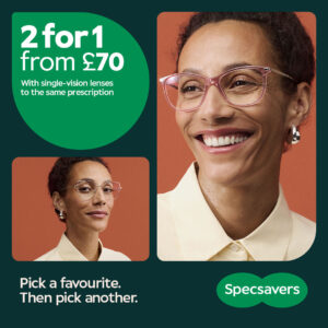 At Specsavers you can choose two styles with their 2 for 1 offer from £70, including single-vision lenses to the same prescription – ask the team for details. The lenses included are standard single-vision lenses. Conditions apply. Visit specsavers.co.uk or ask in store for details.